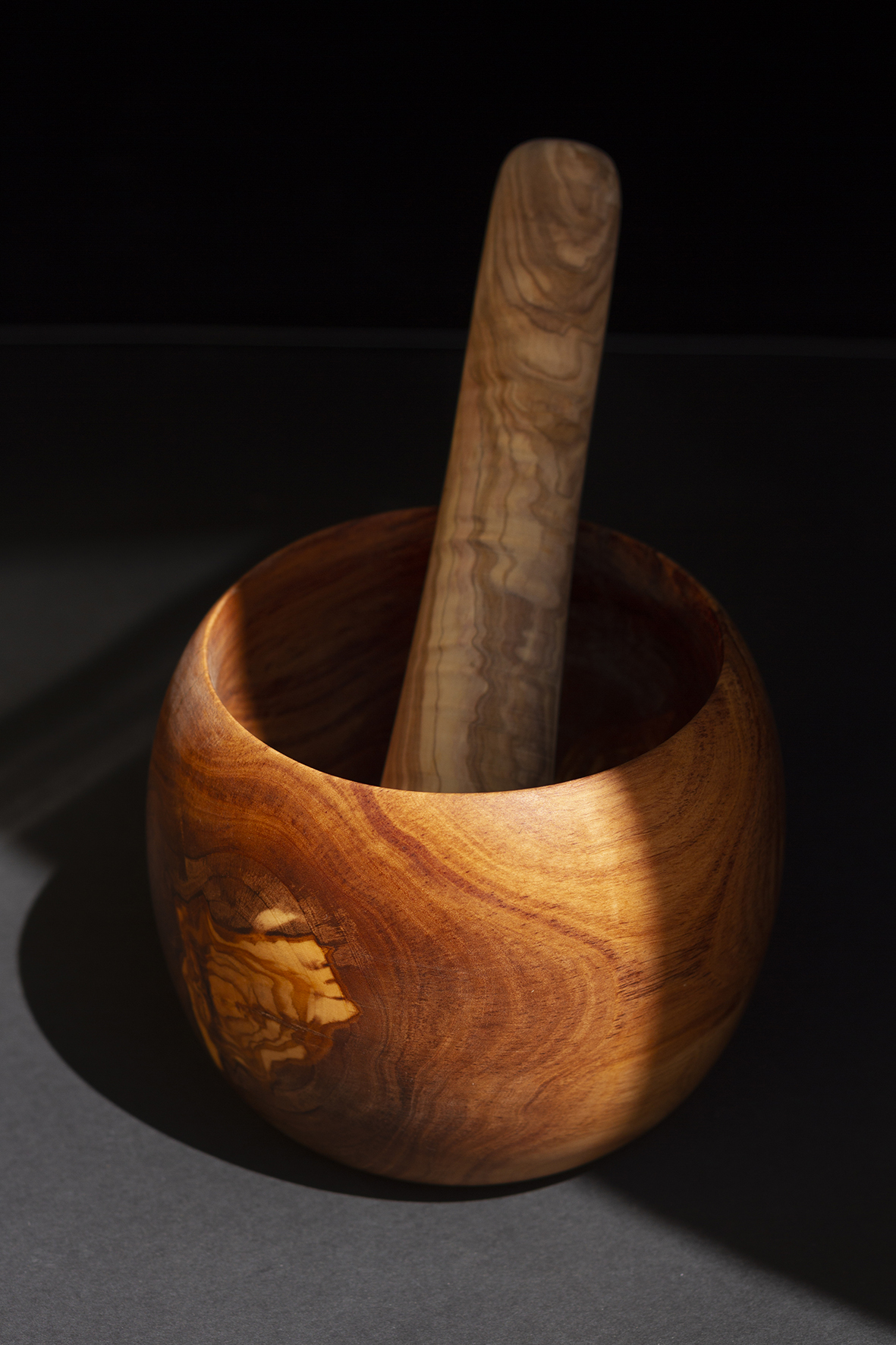 mortero de madera, mortero ovalado, mortero artesanal, utensilios de cocina, madera de olivo, moler especias, estilo rústico